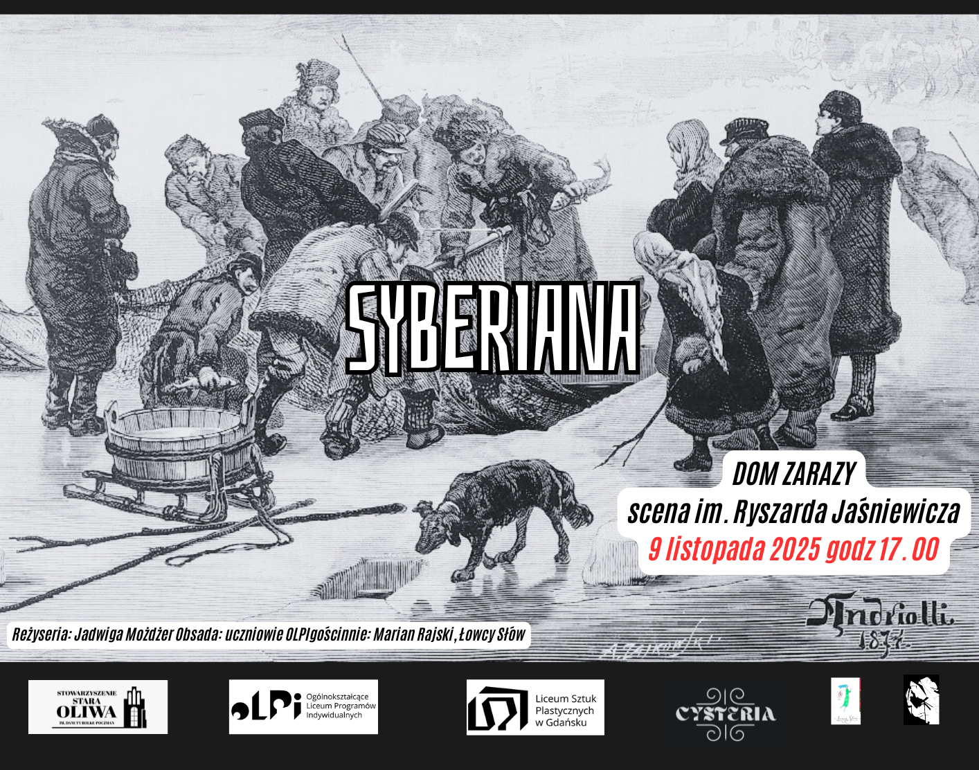 Serdecznie zapraszamy na spektakl pt.: “Syberiana” w dniu 9 listopada 2025 o godz. 17.00 na scenie im. Ryszarda Jaśniewicza, w Domu Zarazy, ul Sary Rynek 15, Gdańsk. To spotkanie z historią zapisaną w listach, wspomnieniach i pieśniach. Program pod kierownictwem artystycznym Jadwigi Możdżer przygotowali uczniowie specjalizacji teatralnej Ogólnokształcącego Liceum Programów Indywidualnych. Gościnnie wystąpi aktor przedwojennego pokolenia Marian Rajski oraz „Łowcy...